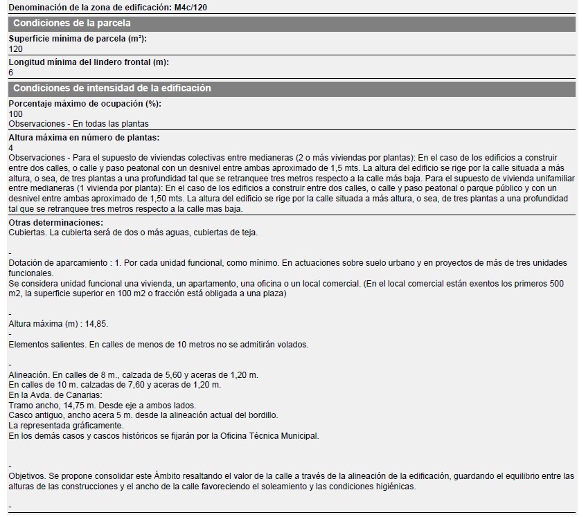 Observaciones - Para el supuesto de viviendas colectivas entre medianeras (2 o más viviendas por plantas): En el caso de los edificios a construir entre dos calles, o calle y paso peatonal con un desnivel entre ambas aproximado de 1,5 mts. La altura del edificio se rige por la calle situada a más altura, o sea, de tres plantas a una profundidad tal que se retranquee tres metros respecto a la calle más baja. Para el supuesto de vivienda unifamiliar entre medianeras (1 vivienda por planta): En el caso de los edificios a construir entre dos calles, o calle y paso peatonal o parque público y con un desnivel entre ambas aproximado de 1,50 mts. La altura del edificio se rige por la calle situada a más altura, o sea, de tres plantas a una profundidad tal que se retranquee tres metros respecto a la calle mas baja.