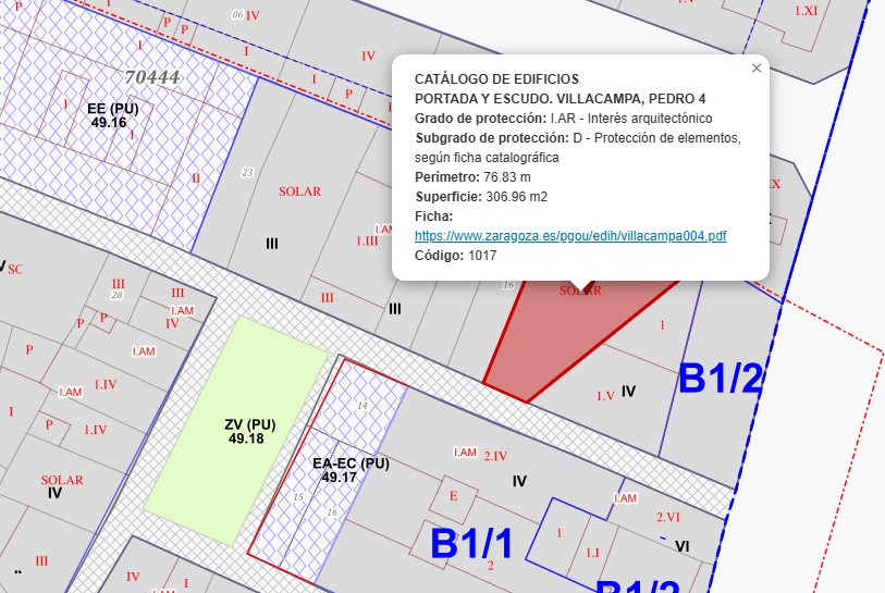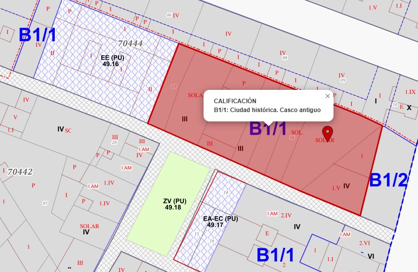 Comentarios: Referencia Catastral: 7044415XM7174C0001IB. CLASIFICACIÓN URBANÍSTICA: Suelo Urbano Consolidado. NORMATIVA ORDENANZA ZONAL: Zona B1 grado 2. USO CUALIFICADO: Residencial. PARÁMETROS: -Ordenación: Fachada alineada al vial -Superficie de parcela mínima: No se establece -Coeficiente de ocupación: 100% en plantas sótano y semisótano, 75% en planta baja y alzadas. -Altura máxima: P. Regulación Centro Histórico, IV (Según Ficha Catalogación) Edificabilidad: 3,15 m2t/m2s -Aparcamiento: Se trata de una fachada protegida en el que las dimensiones del hueco a conservar (2-2,25 m) son inferiores a las dimensiones mínimas establecidas en el Art. 10 de las Ordenanzas para la construcción, instalación y uso de garajes, acceso de 3,00 m de anchura. Por este motivo no se contempla la reserva de aparcamiento. Uso característico: Residencial colectiva - Usos compatibles: Unifamiliar, residencia comunitaria y hotelero, pequeños talleres artesanos y almacenes en determinadas condiciones, comercial, oficinas, recreativos en plantas sótano, semisótano y baja, equipamientos y servicios y edificios de estacionamiento.