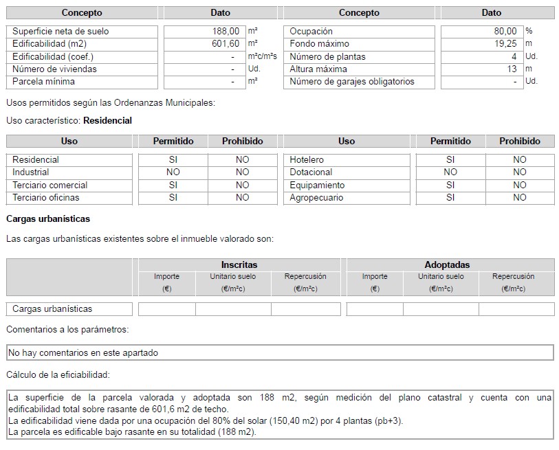 La superficie de la parcela valorada y adoptada son 188 m2, según medición del plano catastral y cuenta con una edificabilidad total sobre rasante de 601,6 m2 de techo.